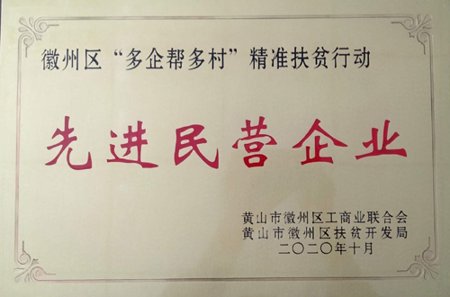 2020年10月13日,區(qū)工商聯(lián)、區(qū)扶貧開(kāi)發(fā)局聯(lián)合在呈坎鎮(zhèn)容溪碼頭農(nóng)產(chǎn)品展銷(xiāo)會(huì)上舉行“多企幫多村”精準(zhǔn)扶貧行動(dòng)先進(jìn)民營(yíng)企業(yè)表彰大會(huì)。包括我公司在內(nèi),徽州區(qū)共有20家企業(yè)獲此殊榮。